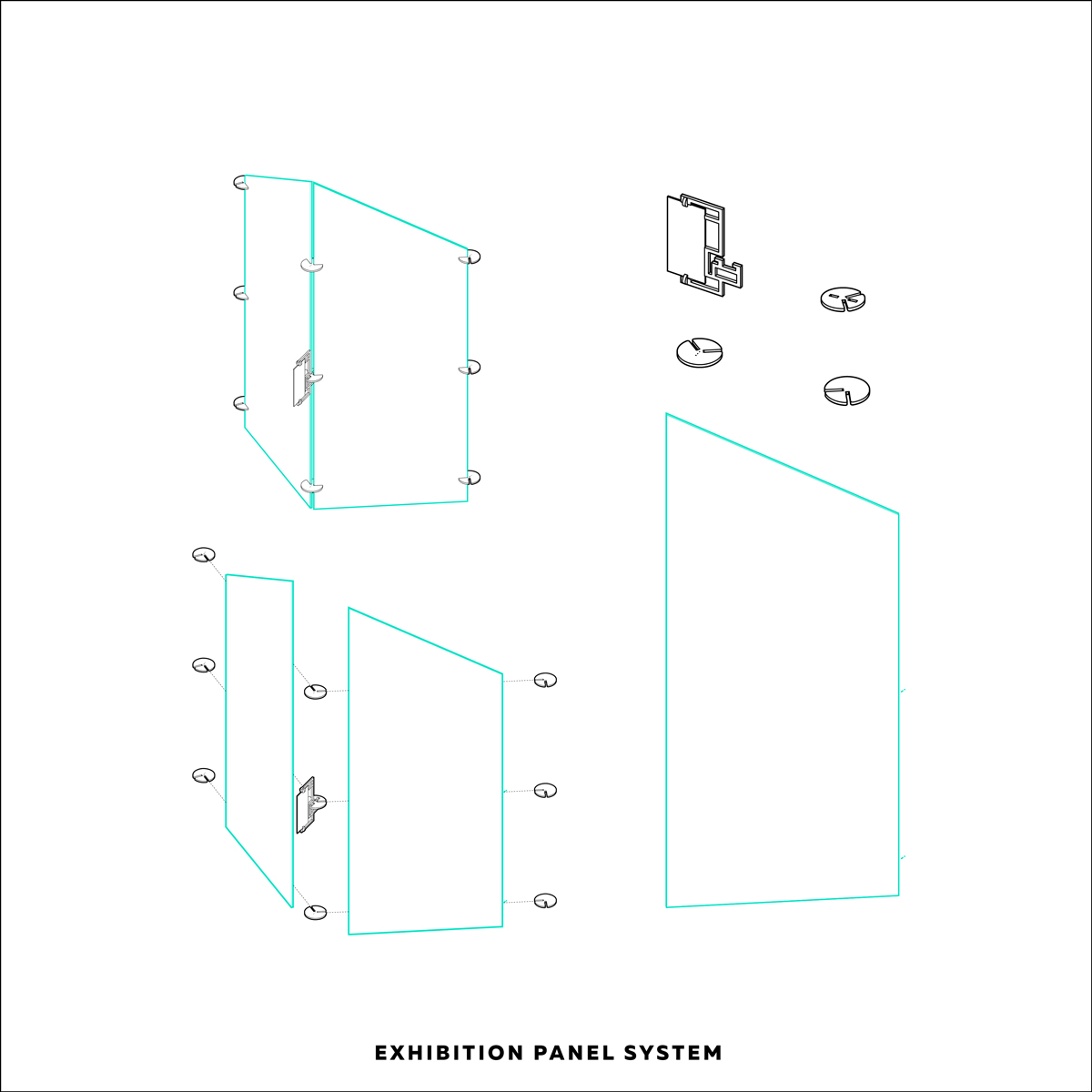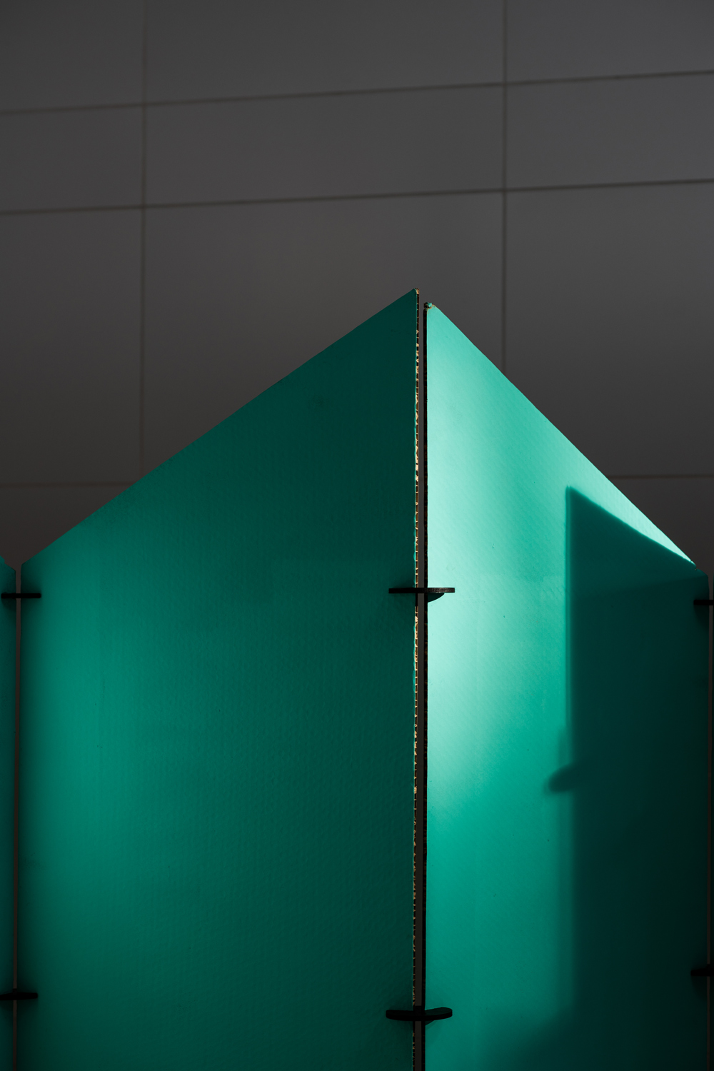 An exhibition space capable of hosting work and events while simultaneously retaining a degree of autonomy as a monument. Each spatial zone is defined by a distinct color and connected with a series of joints and quasi-figural components. Each component is able to come apart and reconfigure, able to adapt to changes in angle and shape of the exhibition panels. Cut from 1.2 x 2.4 m. boards, the negatives of the components double as totems between each space and are painted with distinct patterns and used as AR markers in accessing the virtual portion of the exhibition. The tables echo this presence, able to take on multiple formations as either independent elements scattered about or grouped and joined together through interlocking elements. The combination of the aforementioned explores the transformative capacity for reuse to become 'new', as well as how the creation of a space and functional artifacts imbued with some degree of character can produce an affective quality, allowing the space to alternate between background and foreground.